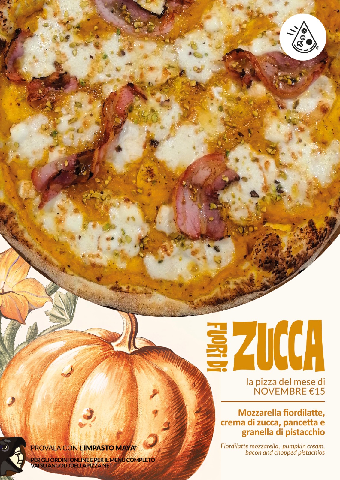 Torna la pizza gustosa, deliziosa e arancionosa dell’anno: la Fuori di Zucca, la pizza del mese di novembre de L’Angolo della Pizza. Mozzarella fiordilatte, crema di zucca, pancetta e granella di pistacchio, vi faranno internare nel reparto dei buongustai. Se sei pazzo per la pizza, questa non la puoi perdere!