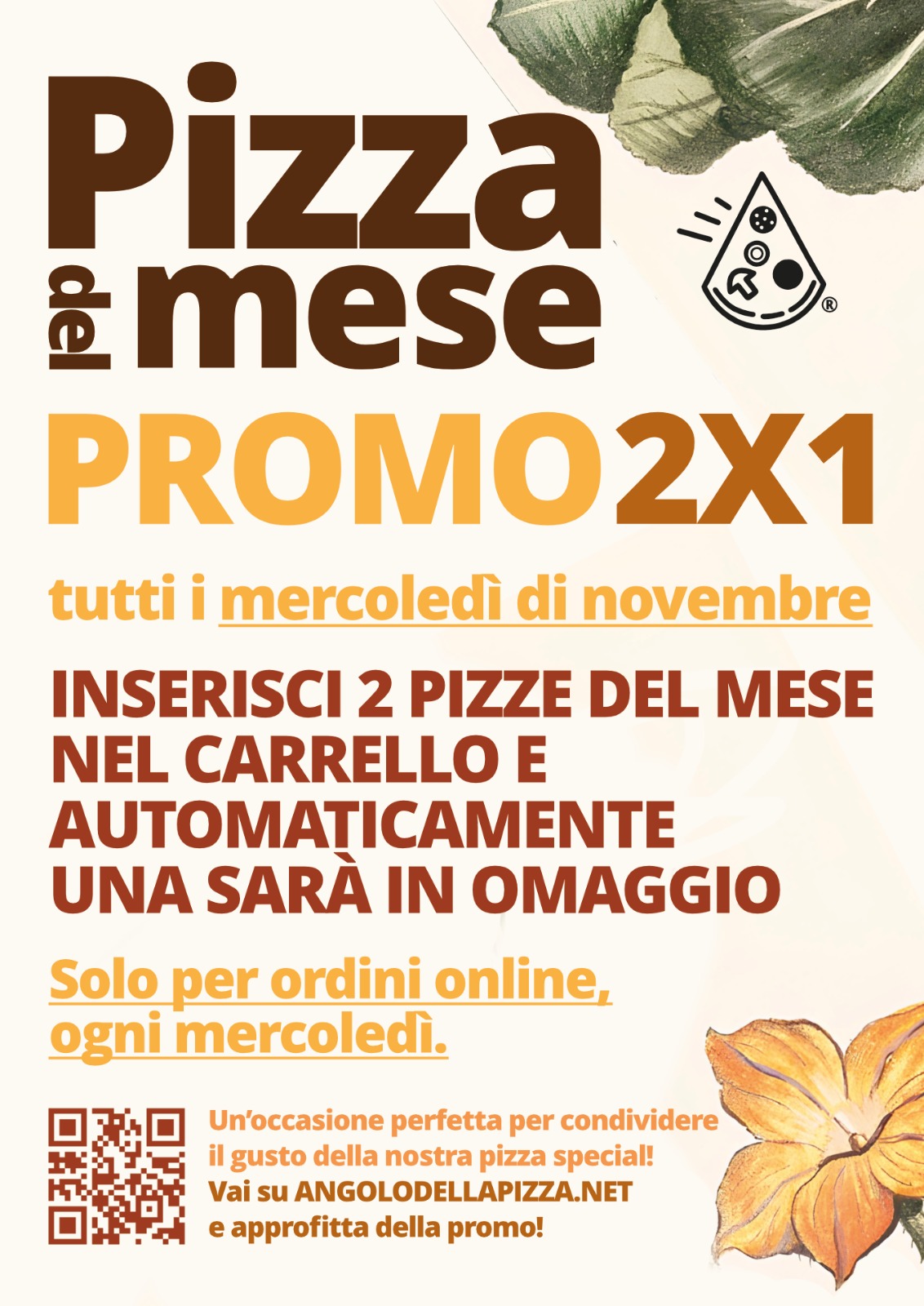 Questo mese torna la promo 2×1! Tutti i mercoledì del mese di novembre, ordinando solo online la pizza del mese, ne riceverai 2 al prezzo di 1. Spettacolo!
